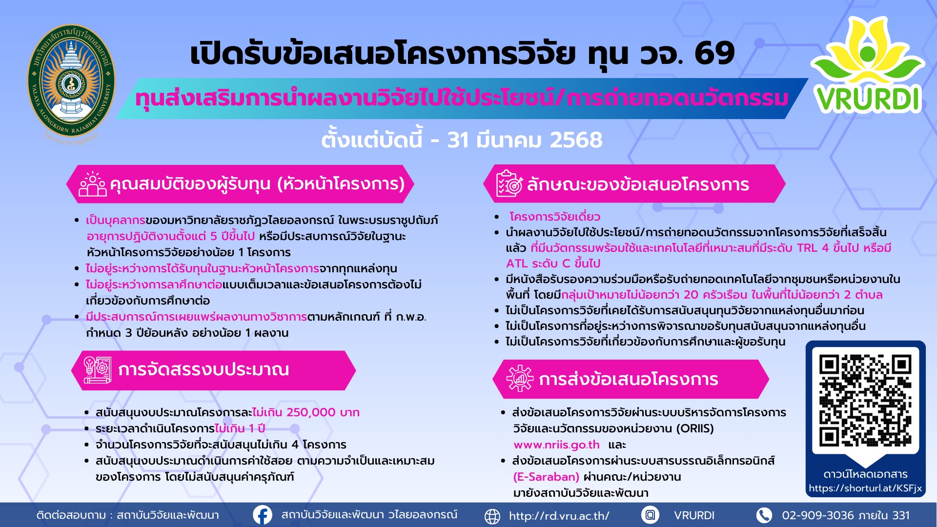 โทรศัพท์ 0-2909-3036 มือถือ 063-2200390 e-mail: research@vru.ac.th