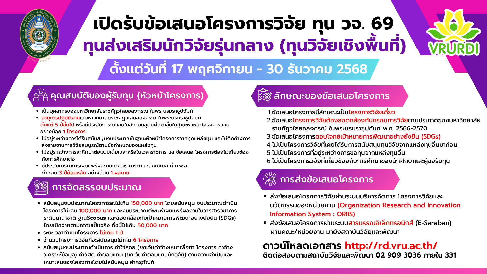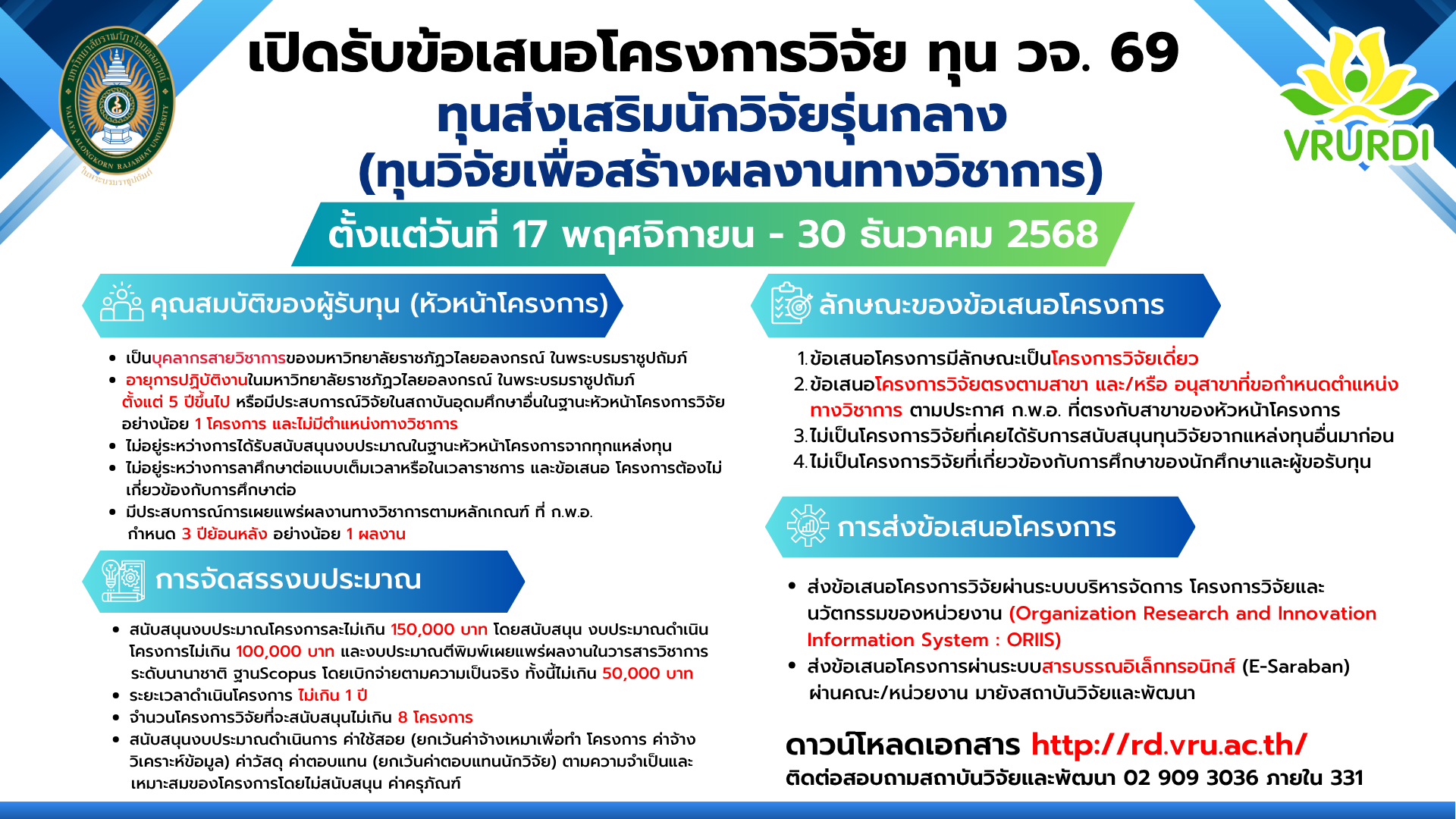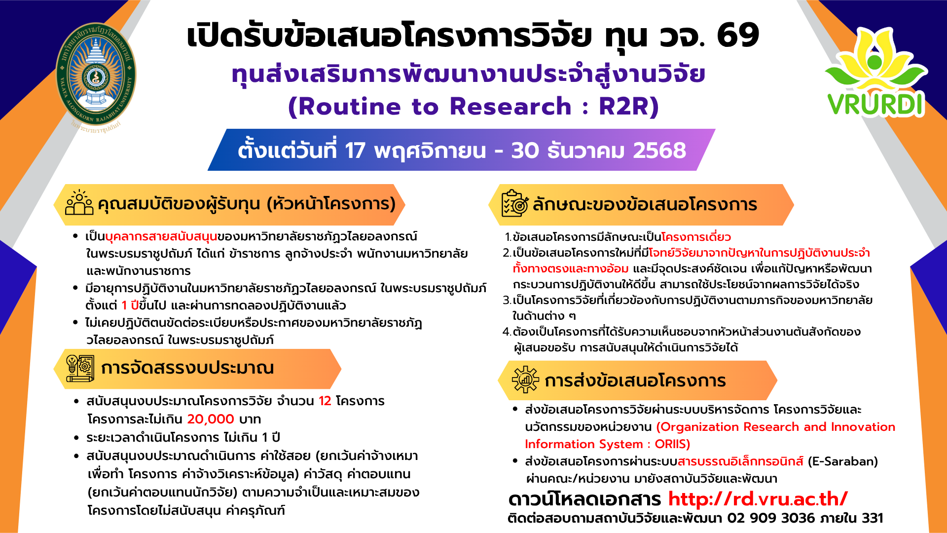 โทรศัพท์ 0-2909-3036 มือถือ 063-2200390 e-mail: research@vru.ac.th